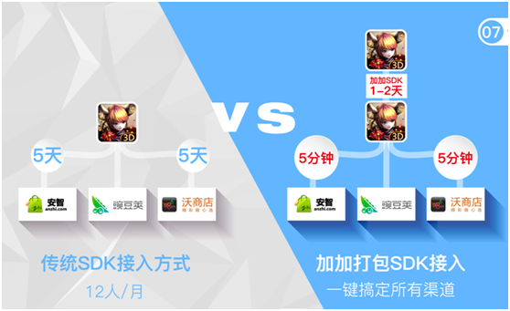 首先,我們先來了解下一鍵打包功能。傳統(tǒng)SDK接入方式費(fèi)時(shí)費(fèi)力,cp在對接一款渠道需要耗費(fèi)3-4天,并且渠道最終掌控著玩家。相比之,使用加加打包助手,只需一次性接入加加SDK,就可一鍵搞定所有的渠道包,且終生受用。