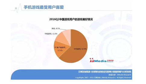 9月2日,艾媒咨詢發(fā)布《2016Q2中國手機(jī)游戲市場季度監(jiān)測報告》(以下簡稱《報告》),數(shù)據(jù)顯示,2016Q2,中國手機(jī)游戲市場規(guī)模達(dá)232.6億元;中國手機(jī)游戲用戶規(guī)模達(dá)5.12億,市場整體和用戶兩者的增長勢頭均保持持續(xù)放緩。數(shù)據(jù)中還顯示,2016Q2,62.9%的受訪用戶表示最喜歡的游戲類型為手機(jī)游戲;手機(jī)游戲由于硬件便攜、操作門檻低等原因受到了用戶的歡迎。